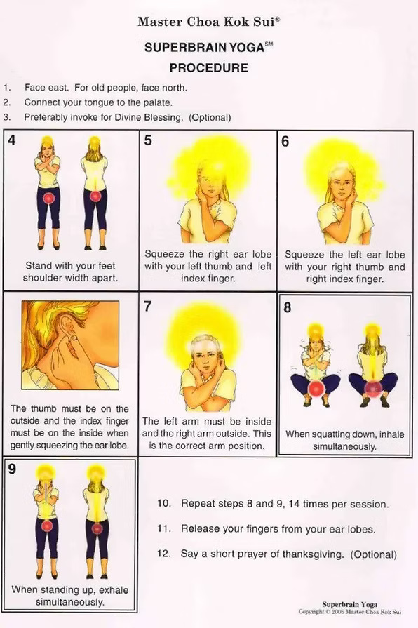 இது நுட்பமான ஆற்றல் மற்றும் காது குத்தூசி மருத்துவத்தின் கொள்கைகளை அடிப்படையாகக் கொண்டது. இந்த சக்திவாய்ந்த நுட்பம் மாஸ்டர் சோவா கோக் சூயின் சூப்பர்பிரைன் யோகா என்ற புத்தகத்தில் விளக்கப்பட்டுள்ளது. இந்தப் பயிற்சியை ஒரு நாளைக்கு 60 வினாடிகளுக்கும் குறைவாகவே செய்ய வேண்டும். இருப்பினும், சிறந்த முடிவுகளுக்கு, நிலைத்தன்மை மற்றும் சரியான நுட்பத்தைப் பின்பற்ற வேண்டும்:
